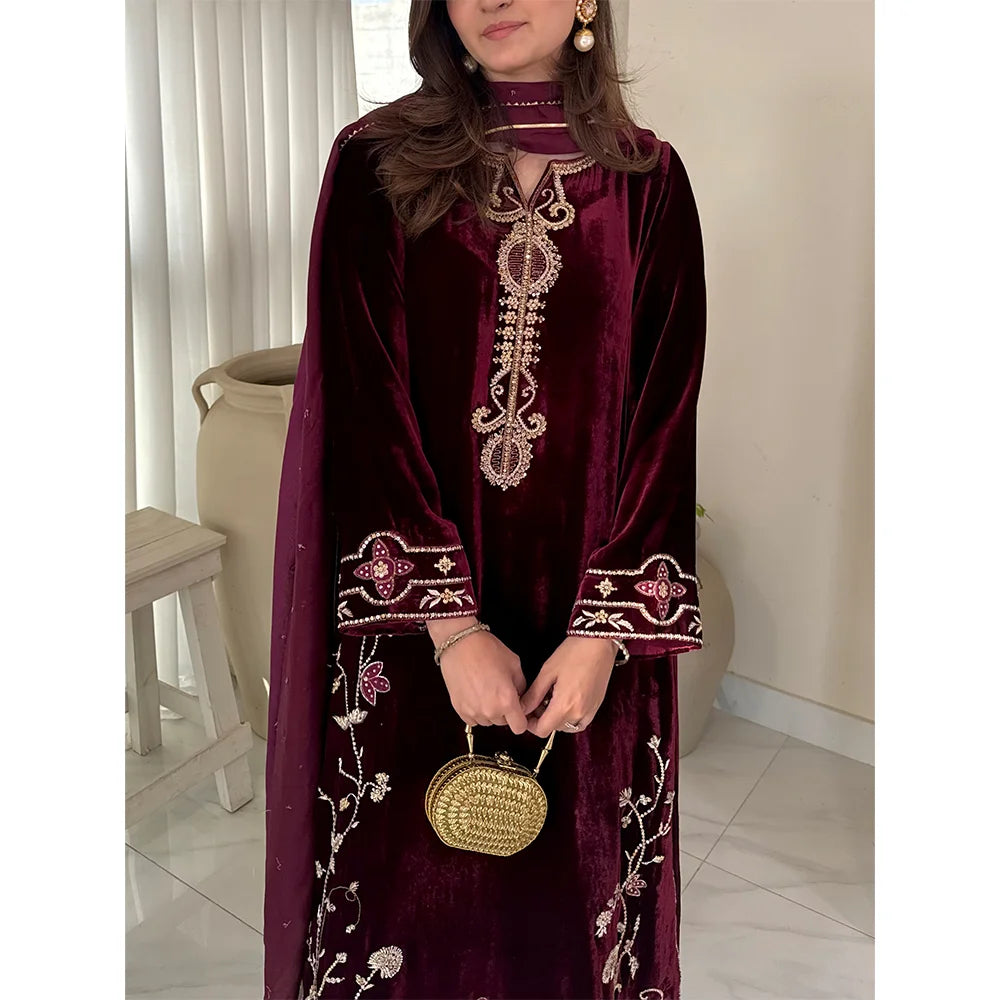Aelia Maroon Imperial Embroidery Velvet Suit
